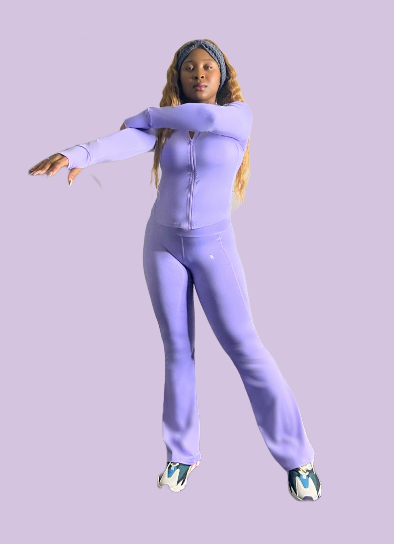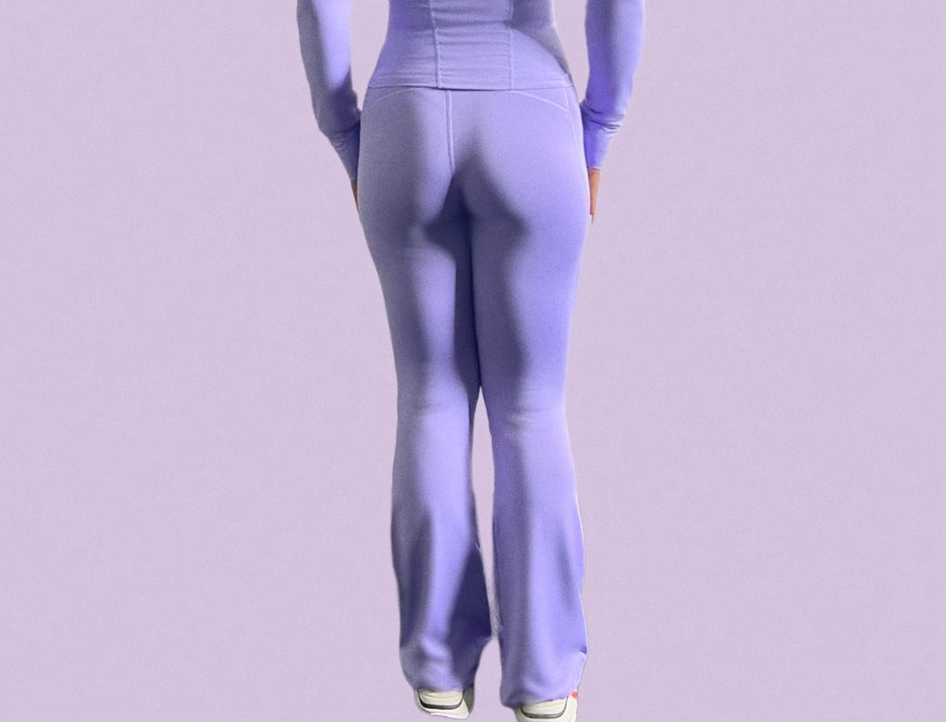 The Lavender Performance Workout Set exudes style and functionality. Crafted to provide comfort and breathability for everyday wear/ during your most intense workouts. The flattering flare pants provide a sculpted silhouette, with a supportive matching jacket. Perfect for yoga sessions, gym workouts, or athleisure wear, this lavender set is the epitome of comfort and style.